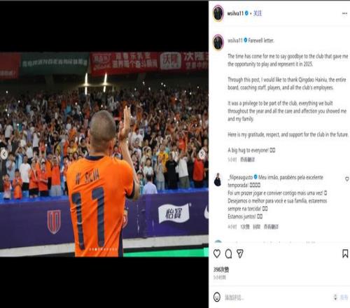 除了韩镕泽转会辽宁铁人,青岛海牛还面临着外援离队的情况。球队保级大功臣之一的韦林顿-席尔瓦在个人社交账号上发文,向俱乐部和球迷告别。