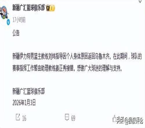 新疆男篮主帅刘炜过去6场比赛输球5场,一波3胜6负的开局同样引发教练组变动,根据新疆官方社媒的公示,刘炜将会退出主帅的位置。有消息称目前正在新的主帅筛选工作,前男篮助理教练格兰成为潜在人选。