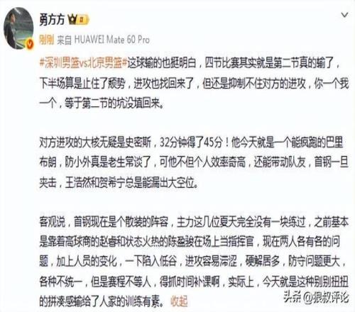 媒体人勇方方发文点评:这球输的也挺明白,四节比赛其实就是第二节真的输了,下半场算是止住了颓势,进攻也找回来了,但还是抑制不住对方的进攻,你一个我一个,等于第二节的坑没填回来。