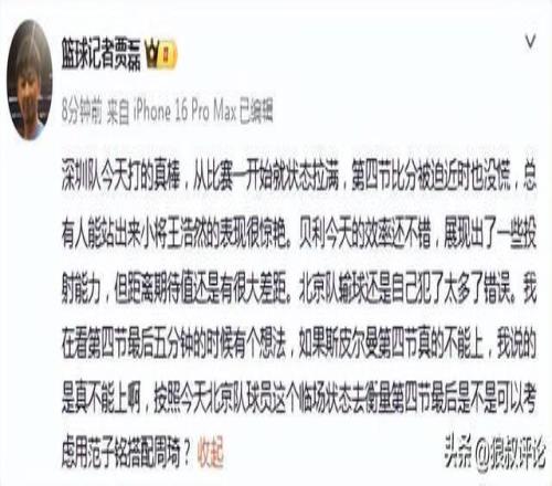 篮球记者贾磊发文点评:“深圳队今天打的真棒,从比赛一开始就状态拉满,第四节比分被迫近时也没慌,总有人能站出来小将王浩然的表现很惊艳。贝利今天的效率还不错,展现出了一些投射能力,但距离期待值还是有很大差距。”
