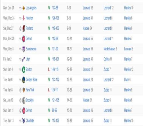ESPN给出一项数据,自19-20赛季,伦纳德拿30+时快船60胜16负联盟最佳,他也连续21场比赛拿到20+,距离生涯21场的纪录只差1场,这项数据说明伦纳德的身体状态极佳。